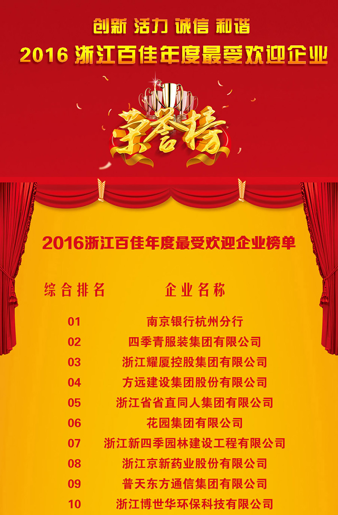 為推動(dòng)浙江省企業(yè)的誠(chéng)信和諧經(jīng)營(yíng),增添企業(yè)的創(chuàng)新發(fā)展活力和動(dòng)力,由浙江經(jīng)濟(jì)網(wǎng)、新華網(wǎng)浙江頻道主辦,由中共浙江省委政法委員會(huì)、浙江省人大內(nèi)務(wù)司法委員會(huì)、浙江省人民檢察院、浙江省科學(xué)技術(shù)廳、浙江省公安廳、浙江省環(huán)境保護(hù)廳、浙江省住房和城鄉(xiāng)建設(shè)廳、浙江省國(guó)家稅務(wù)局、浙江省政協(xié)經(jīng)濟(jì)委員會(huì)、浙江省總工會(huì)、新華網(wǎng)等單位指導(dǎo),于2016年12月聯(lián)合舉辦的“2016浙江百佳年度最受歡迎企業(yè)” 榮譽(yù)榜推選活動(dòng)日前揭曉,我公司在眾多參評(píng)企業(yè)中脫穎而出,取得了第十名的佳績(jī)。