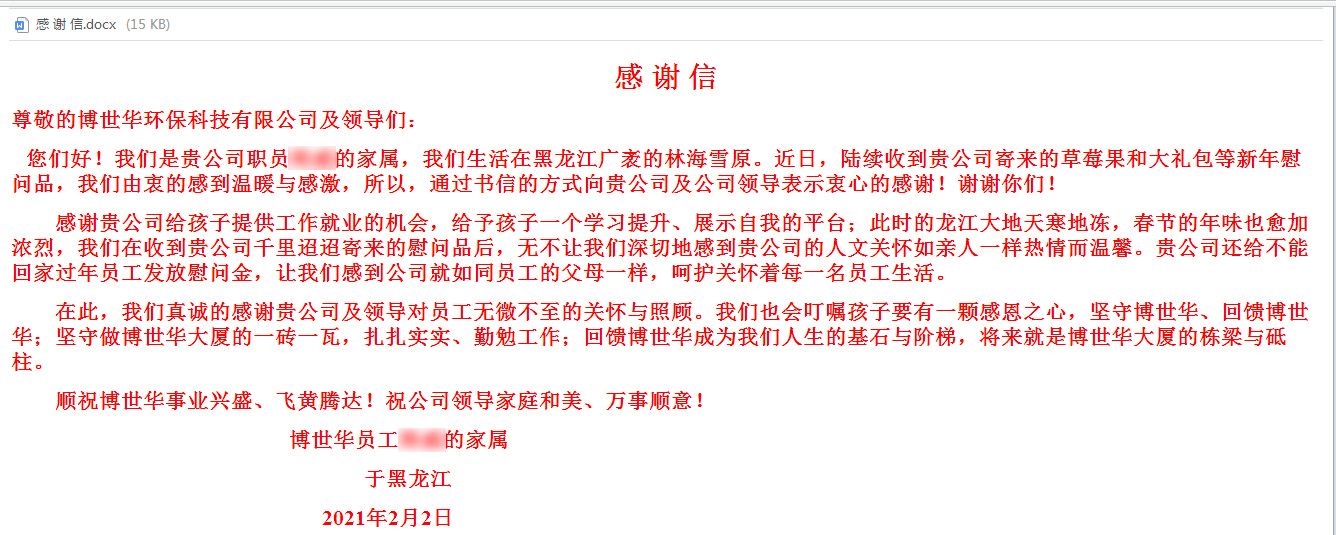 送“溫暖”:公司的發展壯大,離不開每一位員工家屬的鼎力支持和默默奉獻。公司加大對假期堅守崗位、不能回家與親人團聚的員工的關愛,通過“春節大禮包寄親人”等活動,把博世華環保對員工的關心、關愛傳達給留杭、留項目員工家屬。近日,一個個寄托美好祝福的大禮包已陸續寄送至員工家屬手中,有家屬在收到大禮包后,激動地發來感謝信,感謝公司就如同員工的父母一樣,呵護關懷著每一名員工生活及成長,同時也表達出對員工主動留杭的支持及理解。