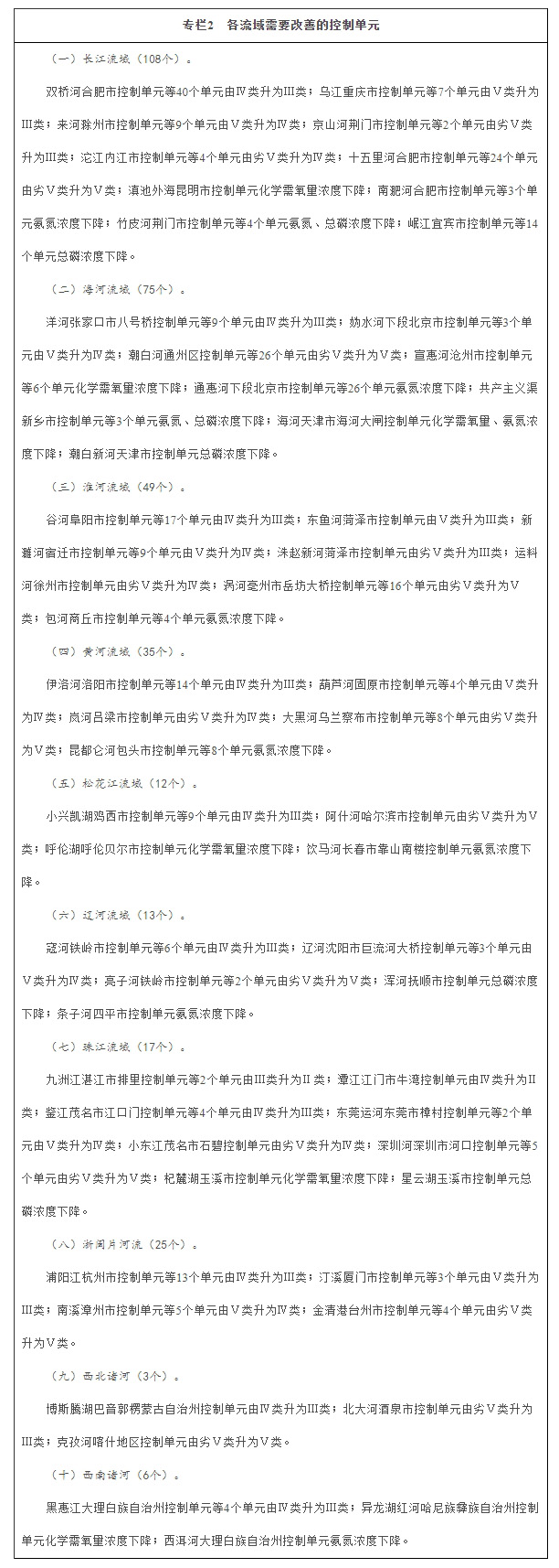 實施以控制單元為基礎(chǔ)的水環(huán)境質(zhì)量目標(biāo)管理。依據(jù)主體功能區(qū)規(guī)劃和行政區(qū)劃,劃定陸域控制單元,建立流域、水生態(tài)控制區(qū)、水環(huán)境控制單元三級分區(qū)體系。實施以控制單元為空間基礎(chǔ)、以斷面水質(zhì)為管理目標(biāo)、以排污許可制為核心的流域水環(huán)境質(zhì)量目標(biāo)管理。優(yōu)化控制單元水質(zhì)斷面監(jiān)測網(wǎng)絡(luò),建立控制單元產(chǎn)排污與斷面水質(zhì)響應(yīng)反饋機(jī)制,明確劃分控制單元水環(huán)境質(zhì)量責(zé)任,從嚴(yán)控制污染物排放量。全面推行“河長制”。在黃河、淮河等流域進(jìn)行試點,分期分批科學(xué)確定生態(tài)流量(水位),作為流域水量調(diào)度的重要參考。深入實施《水污染防治行動計劃》,落實控制單元治污責(zé)任,完成目標(biāo)任務(wù)。固定污染源排放為主的控制單元,要確定區(qū)域、流域重點水污染物和主要超標(biāo)污染物排放控制目標(biāo),實施基于改善水質(zhì)要求的排污許可,將治污任務(wù)逐一落實到控制單元內(nèi)的各排污單位(含污水處理廠、設(shè)有排放口的規(guī)模化畜禽養(yǎng)殖單位)。面源(分散源)污染為主或嚴(yán)重缺水的控制單元,要采用政策激勵、加強監(jiān)管以及確保生態(tài)基流等措施改善水生態(tài)環(huán)境。自2017年起,各省份要定期向社會公開控制單元水環(huán)境質(zhì)量目標(biāo)管理情況。
