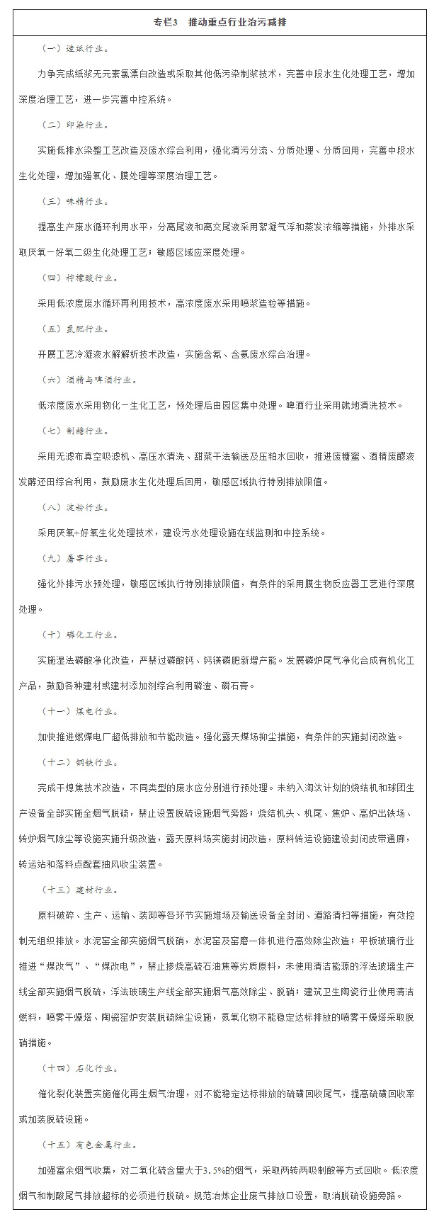 推動治污減排工程建設(shè)。各省(區(qū)、市)要制定實施造紙、印染等十大重點涉水行業(yè)專項治理方案,大幅降低污染物排放強度。電力、鋼鐵、紡織、造紙、石油石化、化工、食品發(fā)酵等高耗水行業(yè)達(dá)到先進(jìn)定額標(biāo)準(zhǔn)。以燃煤電廠超低排放改造為重點,對電力、鋼鐵、建材、石化、有色金屬等重點行業(yè),實施綜合治理,對二氧化硫、氮氧化物、煙粉塵以及重金屬等多污染物實施協(xié)同控制。各省(區(qū)、市)應(yīng)于2017年底前制定專項治理方案并向社會公開,對治理不到位的工程項目要公開曝光。制定分行業(yè)治污技術(shù)政策,培育示范企業(yè)和示范工程。