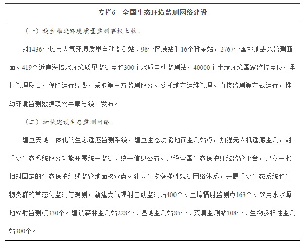 加強生態(tài)環(huán)境監(jiān)測網(wǎng)絡(luò)建設(shè)。統(tǒng)一規(guī)劃、優(yōu)化環(huán)境質(zhì)量監(jiān)測點位,建設(shè)涵蓋大氣、水、土壤、噪聲、輻射等要素,布局合理、功能完善的全國環(huán)境質(zhì)量監(jiān)測網(wǎng)絡(luò),實現(xiàn)生態(tài)環(huán)境監(jiān)測信息集成共享。大氣、地表水環(huán)境質(zhì)量監(jiān)測點位總體覆蓋80%左右的區(qū)縣,人口密集的區(qū)縣實現(xiàn)全覆蓋,土壤環(huán)境質(zhì)量監(jiān)測點位實現(xiàn)全覆蓋。提高大氣環(huán)境質(zhì)量預(yù)報和污染預(yù)警水平,強化污染源追蹤與解析,地級及以上城市開展大氣環(huán)境質(zhì)量預(yù)報。建設(shè)國家水質(zhì)監(jiān)測預(yù)警平臺。加強飲用水水源和土壤中持久性、生物富集性以及對人體健康危害大的污染物監(jiān)測。加強重點流域城鎮(zhèn)集中式飲用水水源水質(zhì)、水體放射性監(jiān)測和預(yù)警。建立天地一體化的生態(tài)遙感監(jiān)測系統(tǒng),實現(xiàn)環(huán)境衛(wèi)星組網(wǎng)運行,加強無人機(jī)遙感監(jiān)測和地面生態(tài)監(jiān)測。構(gòu)建生物多樣性觀測網(wǎng)絡(luò)。