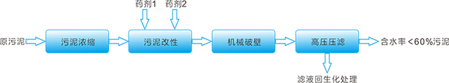 BSH-DeWa? 污泥改性、深度脫水技術采用“化學改性+機械破壁+高壓壓濾”的組合工藝,其工藝流程如下: