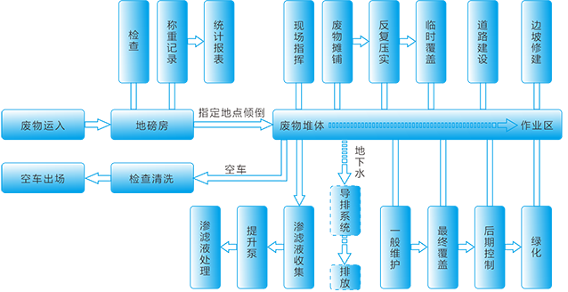 填埋工藝主要有區域法、壕溝法和綜合法三種。填埋工藝原則:減少裸露填埋作業面;分層壓實;控制污染源頭;提前規劃填埋工藝。